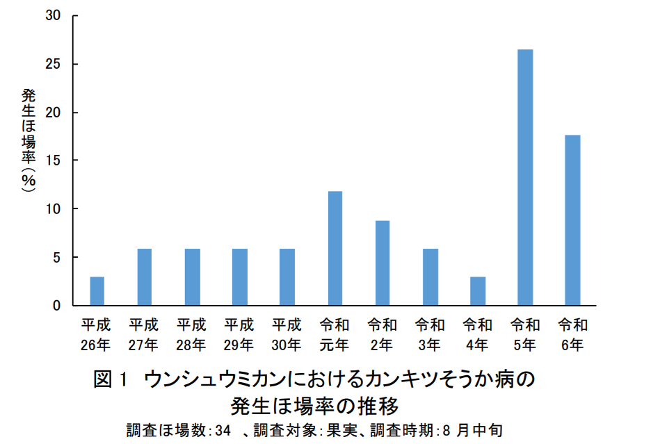 和歌山県内のウンシュウミカンほ場における令和6年8月の発生ほ場率は17.6%(平年6.2%)でした。(図1参照)また、令和5年以降は発生が増加しています。