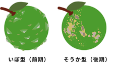 被害葉や被害果が「いぼ型」か「そうか型」により、いつ頃に感染したのかが判別できます。