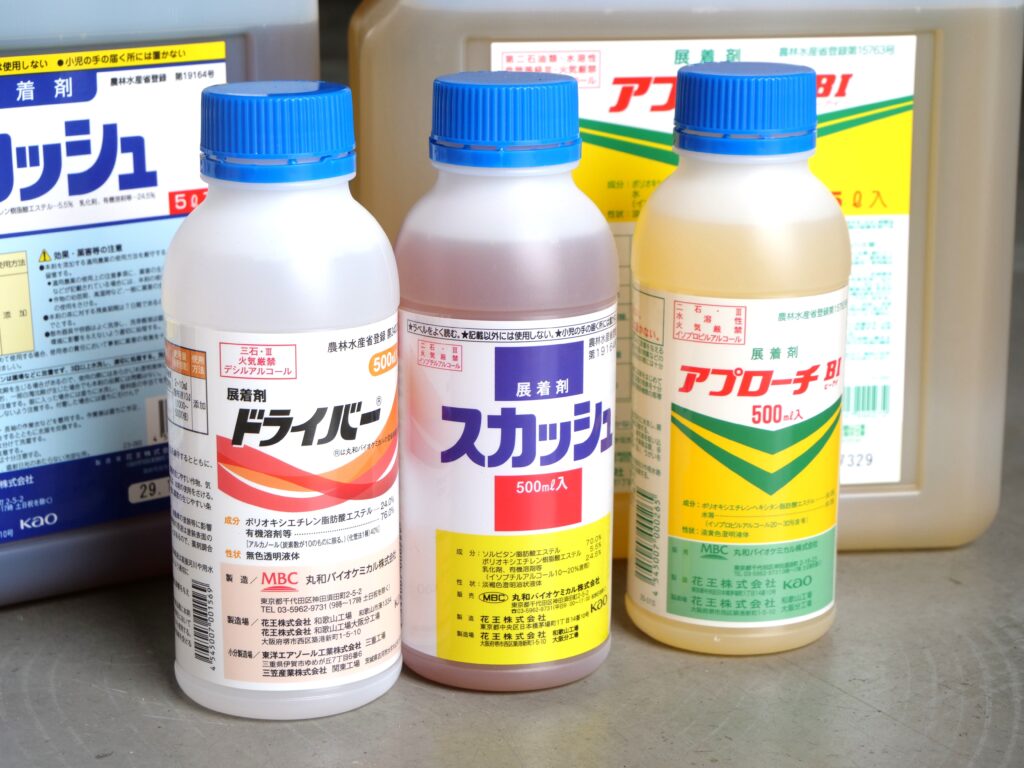 さらにこの機能性展着剤(アジュバント)には殺虫剤や殺菌剤などに広く使用できるタイプと除草剤に添加する、除草剤専用展着剤があります。