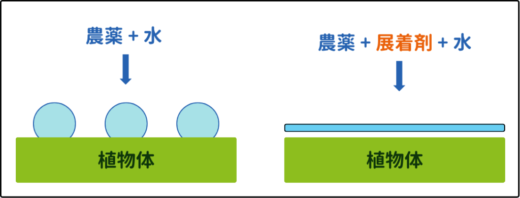 葉や害虫の表面は、薬剤がつきやすいものもあれば弾かれやすいものもあります。農薬を効かせるには、薬液を均一に付着させることが大切です。そのサポートをするのが展着剤。
