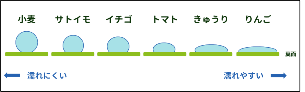 ※濡れ性が悪い作物・・・葉の表面に散布した薬液が広がらず、弾かれてしまう性質をもつ作物のこと。