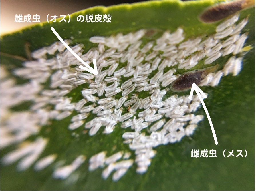 ヤノネカイガラムシはその名の通り、矢じり状の形をした介殻(かいがら)で覆われているため、農薬が効きにくく、防除が難しい柑橘類の主要害虫の一つとされています。